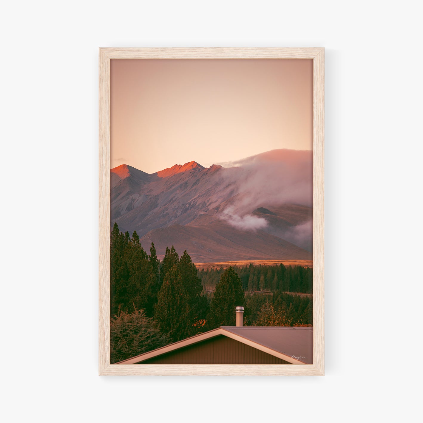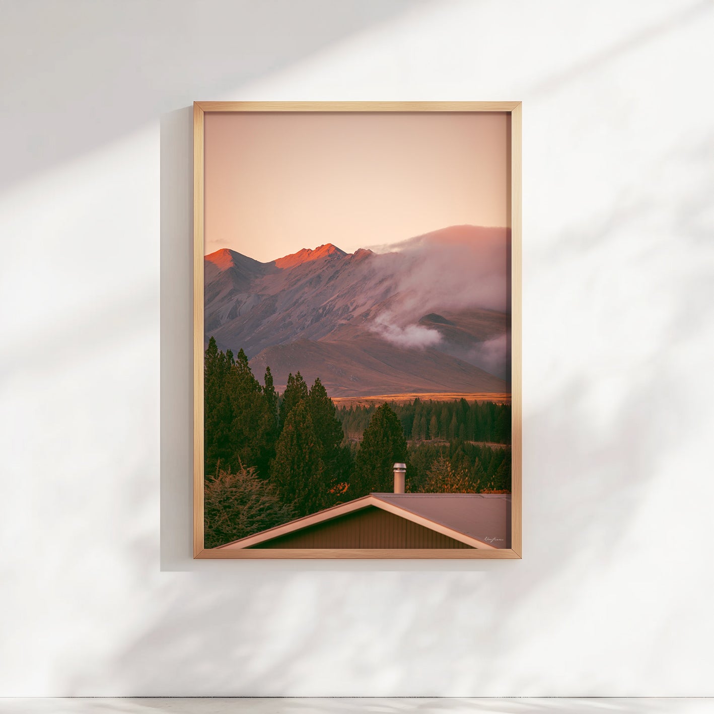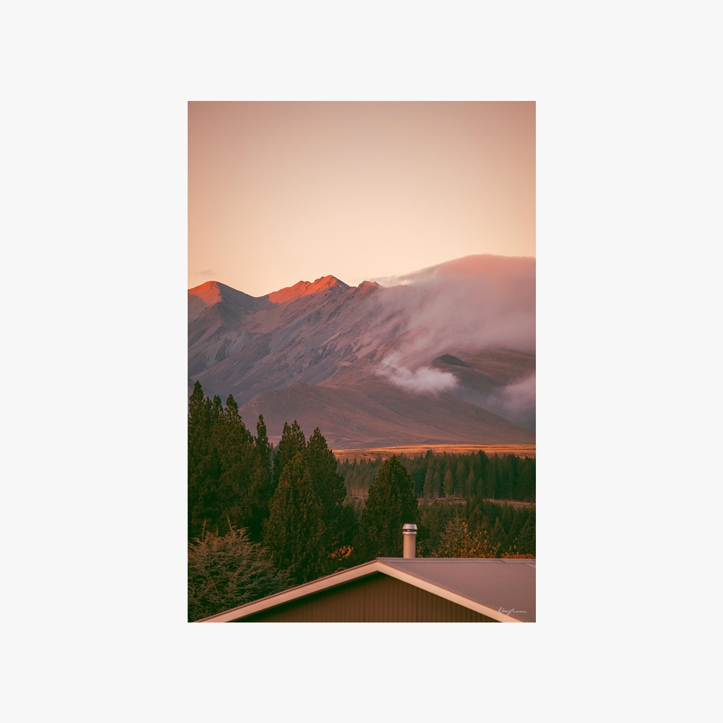 This photograph was taken in Lake Tekapo of the golden clouds rolling in across the glowing mountain ridge, in New Zealand Aotearoa.